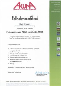 Die Beprobung von Abfällen basiert auf die LAGA PN98. Die Probenahme dient der Probenahme nach Deponieverordnung (DepV), Ersatzbaustoffverordnung (EBV), Bundesbodenschutzverordnung (BBodSchV). Als Fachkundler sind wir in der Lage, auf Grundlage der vorhandenen Informationen Probenahmestrategien zu entwickeln und darauf aufbauend Probenahmepläne zu erstellen. Weiterhin werden Probenahmeprotokolle und Laborprobenbegleitprotokoll auf Unstimmigkeiten analysiert und die Ergebnisse der Analytik bewertet.